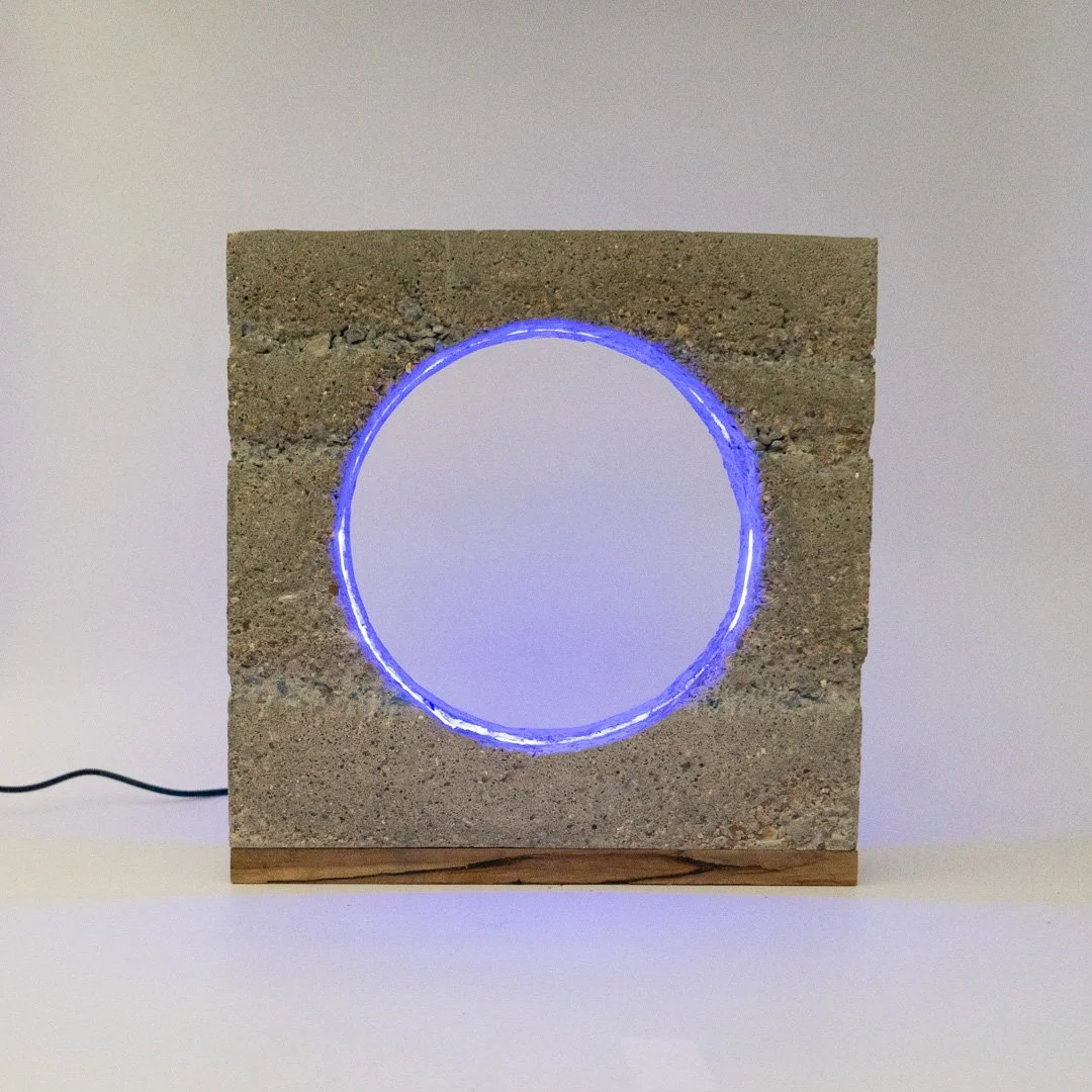 Malibu, 5:42am Concrete with lapis lazuli, LED light, wood, and oil paint (ultramarine). 12"x 12"x 3".